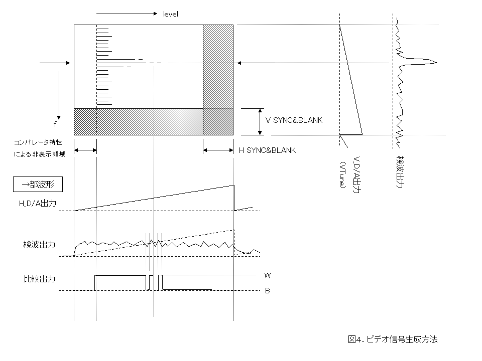 都合上、本機では、垂直同期の鋸波により周波数のsweepを行い、水平同期の