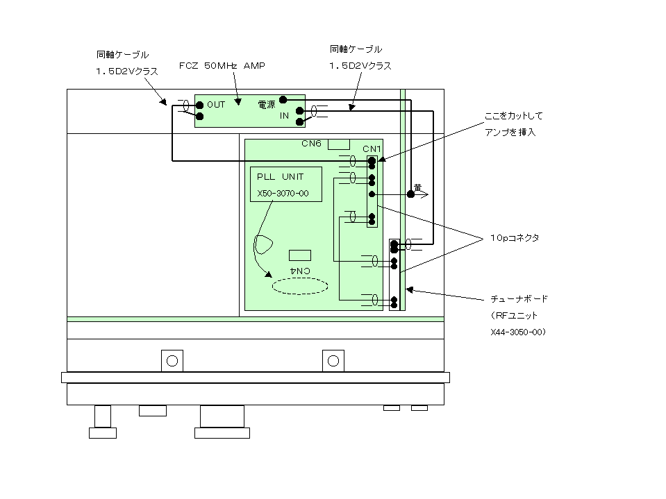 多モード対応機の為、チューナの出力が3系統位(FM−N処理部,FM−W処理部, VIDEO処理部)に分岐されており、チューナ出力のレベルが不足してしまうようです。 そこでFRG−965で実施した内容と同様に、チューナパック出力に IFアンプを追加します。(詳細は下記リンク参照) 使用したアンプは、FCZ研究所製の50MHz帯アンプです。 IF周波数が45MHz付近である事から、アンプの同調周波数を 下げる為に、各コイルにコンデンサの追加が必要です。(数pF) アンプの電源はコネクタに出ているものから引き出します。 アンプを追加後、最良の感度になるようにコアを調整して完成です。 なお、TVチューナとしての性能を確保する場合は、IFアンプの 帯域も広めに取らないといけないかも知れません。 アンプの出力段が複同調となっている事から、帯域を取る調整も 出来そうです。IFアンプ追加方法