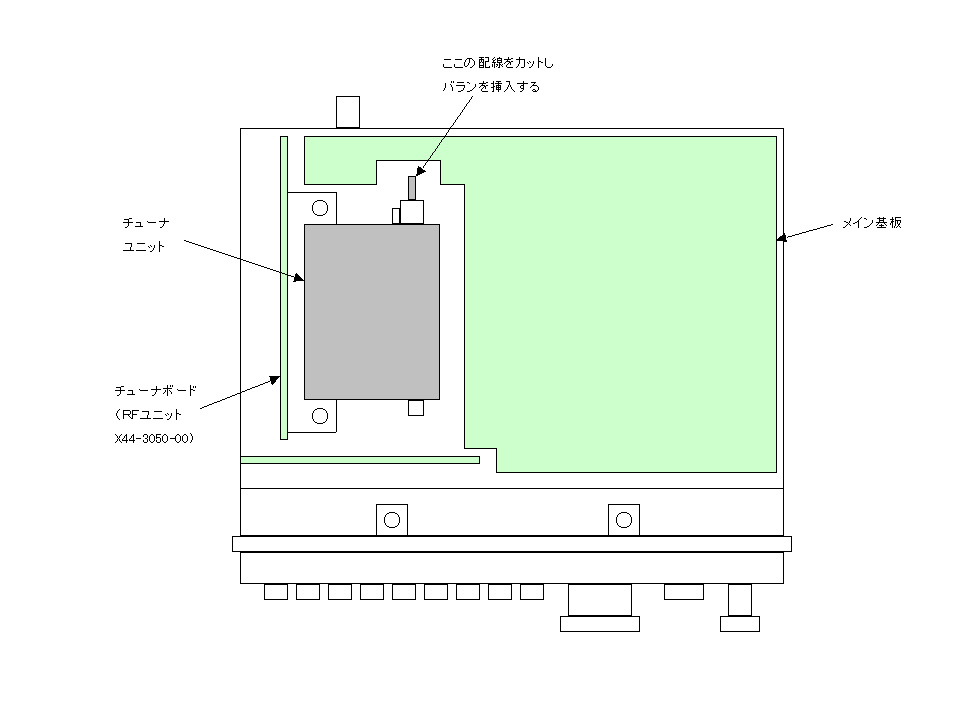私が実施した改造の内容は、FRG−965の項で説明した内容と、 基本的には同じで、チューナパック出力にIFアンプを追加して 分配ロス分を補う事と、UHF入力系のインピーダンスマッチングの 2点です。(ただし、FRG−965で実施したANT入力のチューナ パック直結までは行っていません。)