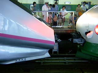 (E3系,200系K編成併合直前 200系の測距センサの窓が開いている) (併合後 200系の尾灯が消えている)