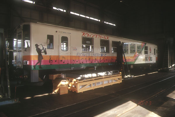 山形県置賜地方を舞台に撮影された映画「SWING GIRLS」(スウィングガールズ)が 2004年9月11日より東宝系にて公開・上映されています。 映画の詳細は「SWING GIRLS」公式サイトをご覧いただくとして・・・ この映画は「山形鉄道フラワー長井線」も撮影の舞台として使用され、車内や 沿線でのシーンが繰り広げられています。 どんな風に登場するかは、映画を見てのお楽しみ。 (もちろん、この映画の一番のメインである出演者自らが演奏するジャズも注目。) この映画に合わせて、山形鉄道フラワー長井線には 「SWING GIRLS」のラッピングが施された、「スウィングガールズ号」