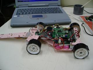 授業中はコースアウトばかり、ナット脱落,タイヤ張り替え,センサ半田不良発見・修理、さらにハンドルボリュームから全く信号が入ってこないなど、とにかく次から次とトラブルばかり。一体どうなっているのやら。