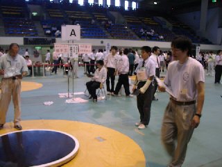 とにかく高校の部土俵が1枚だけだったので自立班に付くことにしました。2回戦の全試合を見、勝ち上がり表をチェックしながら目標のベスト8に届くか検討しました。幸いにも千厩東高校とはベスト8まで当たらない組み合わせで、もしかしたらベスト8に4台残れるかもの期待をして見ていましたが、残念2回戦で3年源間君が1−2の逆転負け、そしてなんと1年安孫子君の「駒見山」が2−1で勝ったにもかかわらず、3005gで反則負けになってしまいました。何が起こったのか、耳を疑いました。目の前が真っ暗になった瞬間です。相手は秋田の横手工高でした。(やはり伝統校、簡単には勝たせてくれません)