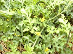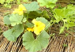 スイカです。こちらも黄色い花で、雄花と雌花があります。スイカは地をはうので、あまりたくさん植えることができません。それでも毎年10こ程のスイカを食べることができます。