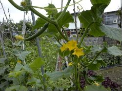キュウリです。こちらも黄色い花です。雌花に実がなります。ほおっておくとどんどん大きくなるので、見逃さずにもぎます。