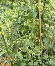 トマトです。黄色いかわいい花を咲かせて、そこに実をつけます。1本の苗から本当にたくさんの実がなります。