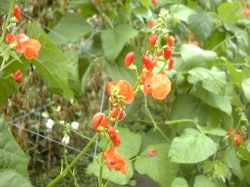インゲンマメです。この辺りでは、「ささぎ」といいます。一般的なインゲンは奧に見えているような白い花を咲かせますが、これはオレンジ色の花を咲かせる品種です。花の形はマメ科特有の蝶の形をしています。