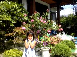 キュウチクトウという花です。ピンクの花です。とてもか細い茎なので、棒で支えています。