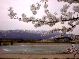 朝日連峰と野川と桜です。すきっとした青空でなかったのが残念でした。