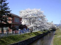 近くの学校の桜です。この日は晴れていたので、シャッターを押しました。木造校舎と桜と、澄んだ青空と、透き通る川の水の美しさが伝わるでしょうか。