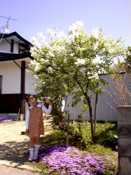 木に咲いている白い花がライラックだそうです。下の花はこれまたシバザクラです。ライラックの白い花と五月晴れの青空はとてもマッチしています。