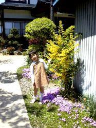 黄色い花は、レンギョウです。下に見えるピンクの花はシバザクラです。どちらも色鮮やかに咲きます。(撮影日99/05/02)