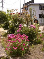 手前がナデシコ、真ん中がシャクヤク、奧の背の高い赤い花がバラです。園芸種でしょうが、きれいな花を咲かせています。
