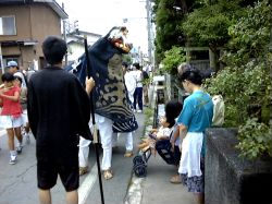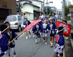 この日は地区の子供育成会が中心となって、近くの神社のお祭りをしました。御神輿と獅子が出ます。ゆうきも御輿かつぎをがんばりました。たいきは初めて見る獅子にびっくりしていたようです。