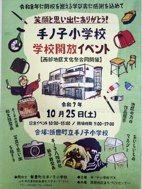学校経営 | 10/25(土) 学校開放イベントを開催します! 本校PTAが主体となり、来年3月に閉校を迎える手ノ子小学校において、標記のイベントを行います。児童生徒の発表やおいしものを取りそろえたマルシェ、地区の方の作品展示など、盛りだくさんの内容となっております。なお、このイベントは西部地区まちづくりセンターと共催となっており、「西部地区文化祭」として翌26日(日)も手ノ子小学校を会場に開催いたします。 是非皆様お誘いあわせの上、遊びにいらしてください! |
