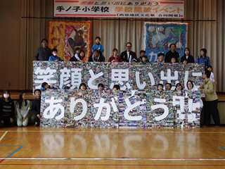 大成功!! 学校開放イベント 10月25日(土)、本校を会場に学校開放イベントが開催されました。 子どもたちははじめに中津川に出かけ、中津川地区文化週間のオープニングイベントとして和太鼓を披露しました。その後手ノ子小学校に戻り、イベントにご来校いただいた皆様に和太鼓を披露しました。 発表の後は、地域の皆様にご準備いただいたおにぎりと豚汁をいただき、その後「写真に思い出を残そうイベント」の仕上げを行いました。最後に「笑顔と思い出にありがとう!!」のパネルの前で、みんな素敵な笑顔で写真に写りました。 この日は地域の方や卒業生を中心にたくさんの方にご来校いただき、大盛況のうちに終了することができました。また、このイベントは西部地区文化祭と合同で開催することができました。西部地区まちづくりセンターの皆様にもたくさんのご協力をいただきました。ありがとうございました! |