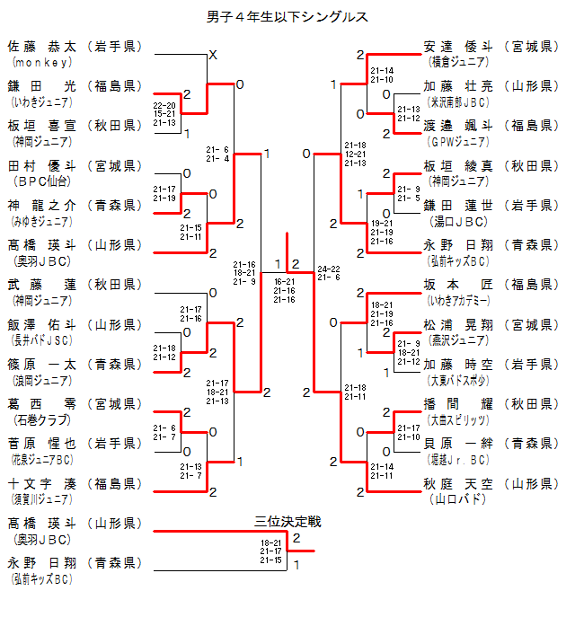 BS4-7 | 燕沢Jr.・[宮城県] | 松浦 晃翔 | 2 | 21- 9 18-21 21-12 | 1 | 加藤 時空 | 大東バドスポ少・[岩手県] | |