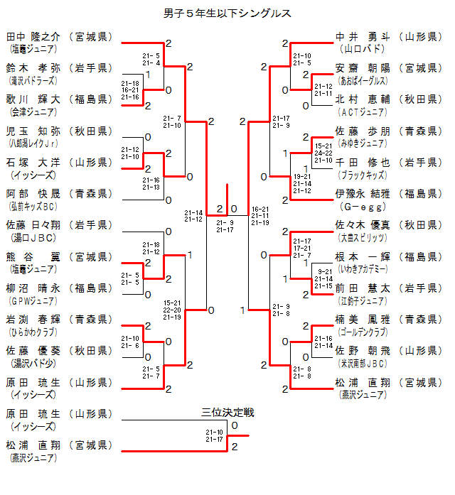 BS5-9 | 塩竈Jr.・[宮城県] | 田中隆之介 | 2 | 21- 5 21- 4 | 0 | 歌川 輝大 | 会津Jr.・[福島県] | |