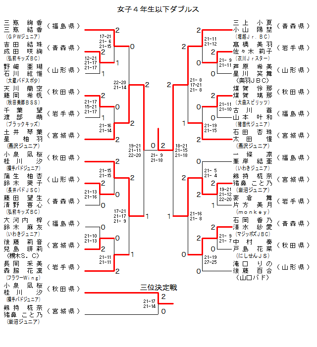GD4-21 | ‰‘òJr.E[‹{錧] | “yˆä ‹Õ—tE¯ —M‰H | ‚Q | 19-21 21-11 22-20 | ‚P | ¬ò “â÷EŒjì Ž¬ | ‰¡ŽèƒoƒhJr.E[H“cŒ§] | |