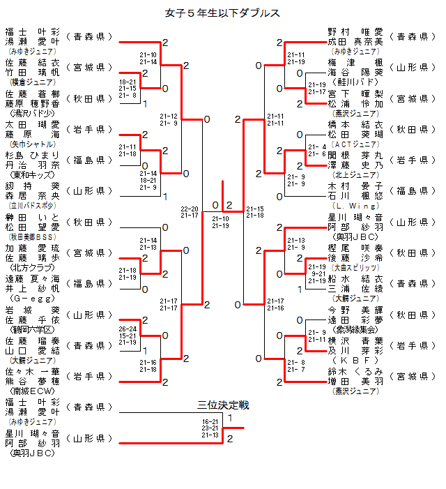 GD5-24 | 奥羽JBC・[山形県] | 星川 瑚々音・阿部 紗羽 | 2 | 16-21 23-21 21-13 | 1 | 福士 叶彩・湯瀬 愛叶 | みゆきJr.・[青森県] |