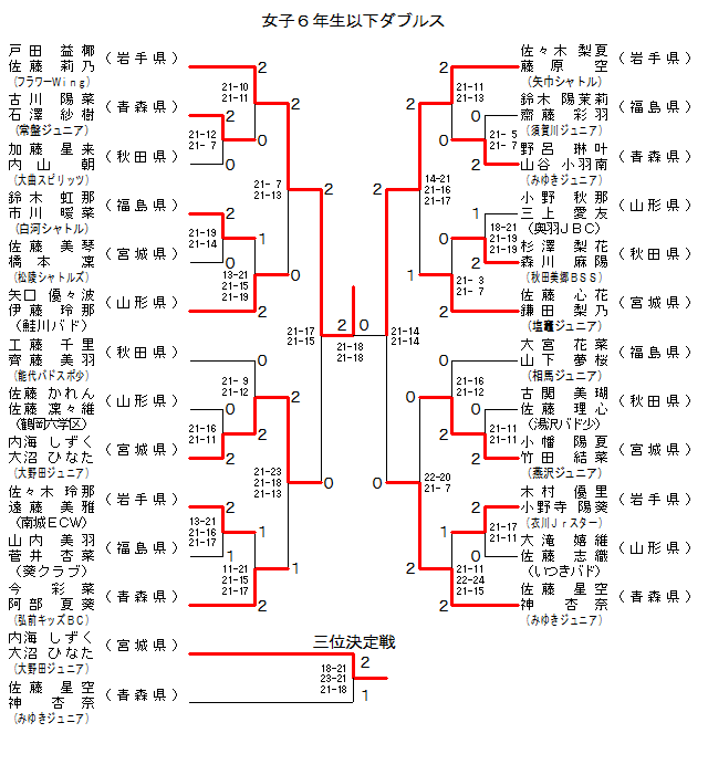 GD6-21 | フラワーWing・[岩手県] | 戸田 益椰・佐藤 莉乃 | 2 | 21-17 21-15 | 0 | 内海 しずく・大沼 ひなた | 大野田Jr.・[宮城県] | |