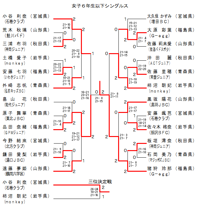 GS6-6 | 常盤Jr.・[青森県] | 佐藤 里穂 | 2 | 21-19 22-20 | 0 | 沖田 麗 | ACTJr.・[秋田県] | |