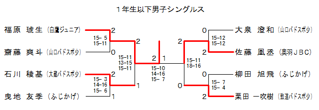 | BS1-1 | 白鷹Jr. | 福原 琥生 | 2 | 15- 5 15-11 | 0 | 齋藤 爽斗 | 山口バドスポ少 | |