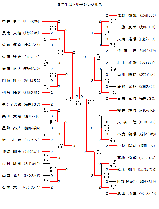 | BS5-20 | 米沢南部JBC | 佐野 朝飛 | 2 | 15- 3 15- 1 | 0 | 伊藤 煌 | 致道バドスポ少 | |