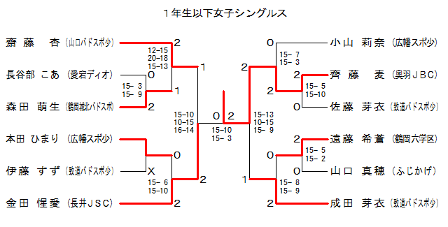 | GS1-10 | 奥羽JBC | 齊藤 麦 | 2 | 15-13 10-15 15- 9 | 1 | 成田 芽衣 | 致道バドスポ少 | |