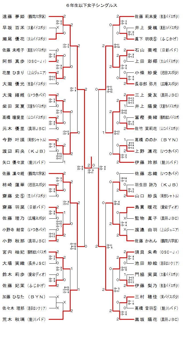 | GS6-2 | OSC−Jr | 阿部 真歩 | 2 | 15- 8 15- 5 | 0 | 佐藤未唯子 | 真室川バドスポ少 | |
