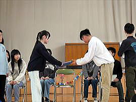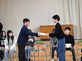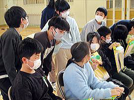 | 2月12日(木) 5年お米の贈呈 5年生がJA青年部の方々よりご指導いただき収穫したお米の一部を、市内の福祉関係施設にお贈りする「贈呈式」を行いました。代表児童がお米の説明を書いた手紙を読み、それぞれの代表の方にお渡ししました。5年生の自慢のお米。味わって食べていただけると嬉しいですね。 |