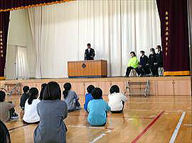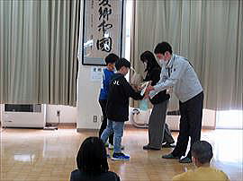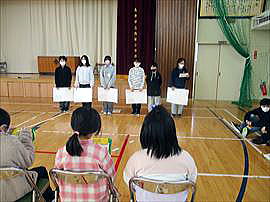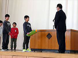| 2月25日(水) 介護用品贈呈式 この日の全校集会は、児童会活動として取り組んできた「アルミ缶回収」の収益で購入した介護用品を市内福祉施設にお贈りする贈呈式でした。「床ずれ防止用マット」と「体圧分散グローブ」をお贈りしました。用品を活用することで、入所者の方が少しでも気持ちよく過ごしていただけたらうれしいです。 |