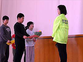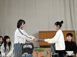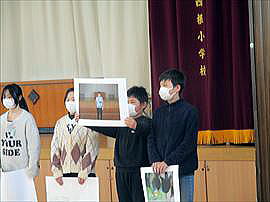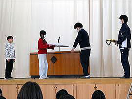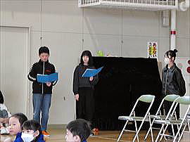 | 3月6日(金) 感謝の会 毎日の登下校時に子供たちの安全を守ってくださっている、交通指導員さん、安全パトロール隊の方々、スクールバスの運転手さんへ感謝の気持ちを表す会が行われました。代表児童からお礼の言葉とささやかなプレゼントをお送りしながら、日ごろの感謝の思いを伝えました。今年度も一年間どうもありがとうございました。 |