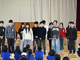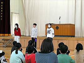 | 10月25日(土) 学習発表会 その2(3年・2年) 3年生は、長井小町の会の先生方に教わった昔語りの発表です。覚えるだけでも大変なのに、方言を駆使しながら強弱、身振りを加えてお話の面白さを伝えました。みんなの心に響く見事な子供語り部でした。 2年生は、歌と演奏、ダンスをで表現する「ようこそ!音楽のくにへ」。2年生は声がとっても出ていて見ている私たちを明るく楽しくうれしい気持ちにさせてくれる、心がぽかぽかになる素敵な発表でした。 |