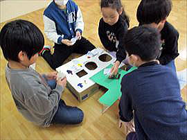 | 12月3日(水) 1年学校体験教室準備 11日の学校体験教室に向け、1年生は年長児との交流の準備をしていました。それぞれの担当に分かれて一緒に楽しむための道具を作っています。1年生が今の2年生と楽しく遊んだ体験教室から早いもので1年が経つんですね。 |
