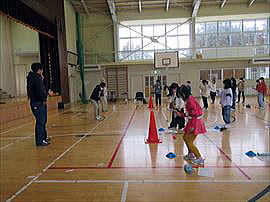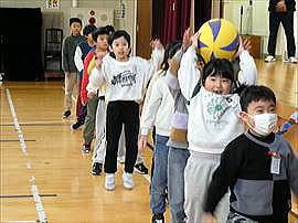 | 9月11日(木) 1・2年まり入れ練習 運動会の低学年団体種目は「まり入れ」です。今日は体育館を使って実際にまり入れをやってみました。よく見ると、まりを入れるかごには、大きいかご・中くらいのかご・そして小さいかごの3つのかごがついていました。いったいどういうことなのでしょう・・・ |
