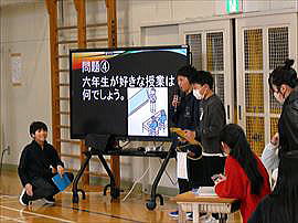 | 2月10日(火) 委員会活動紹介 次年度の委員会活動の準備として、委員会活動紹介が行われました。5・6年生がそれぞれの委員会活動の内容や役割、仕事の達成感などを説明し、3・4年生がそれを聞き質問する形で進められました。6年生の責任感と、これから委員会活動を引き継ぐ5年生の頑張りが光っていました。 |