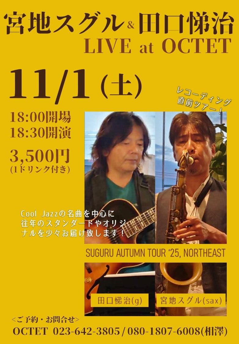 毎年楽しみにしている宮地さんと田口さんのデュオライブ、今回も山形市のオクテットに行ってきました。SNSで宮地さんのクールジャズへの変遷についてのお話やレコード紹介(おはジャズ)を読ませてもらっていて、目前で聴く実際の音がそれらの文字情報と繋がって興味深いところがありました。