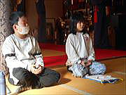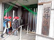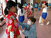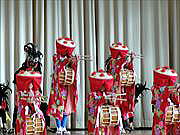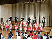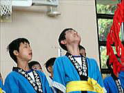 11時に学校に集合して、入念なリハーサルと衣装の準備をして本番に臨みました。この日のお昼は、観光協会様よりいただいたおにぎりです。待っている間にテレビの取材を受けたり、見に来てくれた卒業生と話したりして過ごしましたが、発表が近づくに連れて緊張感も高まってきました。この日の目標は「心込めて発表する」ことです。鳥居をくぐるまでは声を掛け合えますが、鳥居をくぐったら、後は子どもたちに任せるしかありません。見ている私たちもどきどきです。途中、音響トラブルがあったり、草履が脱げたりといったハプニングもありましたが、豊田っ子の心を一つに、心を込めた立派な発表ができたと思っています。見にいらしてくださった方、関係者の皆さま、子どもたちにこのような舞台をつくっていただいて、ありがとうございました。子どもたちの表情からは満足感、達成感が伝わってきました。 |