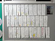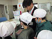 歯科衛生士の皆様によるブラッシング指導をしていただきました。毎年実施していただいています。磨き残しがよくわかる色をつけて、鏡を見ながらみんな熱心です。@歯ブラシは、親指の大きさに合わせて小さめを選び、月に一回は交換すること。A奥歯から1本20〜30秒かけてていねいに磨くこと。B磨き終わったら、つるつるになったか確かめること。教えていただいた3つのポイントをぜひご家庭でも実践してみてください。 |