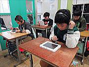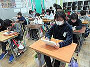 長井市では、市内の5年生全員が英語のGTECテストを受けます。使うものは、タブレットとインカム。数年前には見られない光景ですが、子どもたちは難なく操作し、集中して取り組んでいました。「今の子たち」ですね。 |